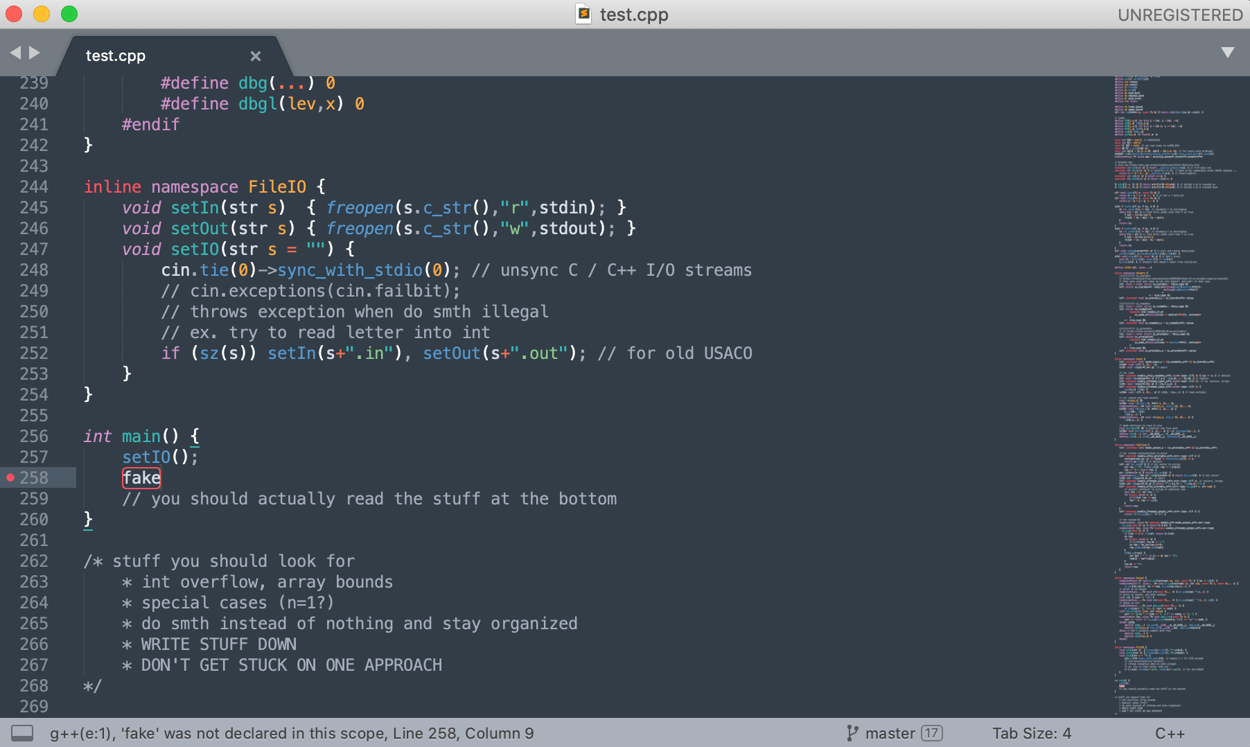 Using an IDEUsing Command LineText EditorsSublime Text Notes (Ben)Further InstructionsIncluding <bits/stdc++.h>UsageOS-Specific RecommendationsLinuxWindowsSimple: MinGW (Minimalist GNU for Windows)Moderate: Microsoft Compiler ToolsetDifficult: Windows Subsystem for Linux (WSL)MacUsing <bits/stdc++.h> Without Installing GCCEdit this pageRunning Code Locally